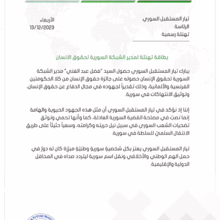 يبارك تيار المستقبل السوري حصول السيد "فضل عبد الغني" مدير الشبكة السورية لحقوق الإنسان حصوله على جائزة حقوق الإنسان من