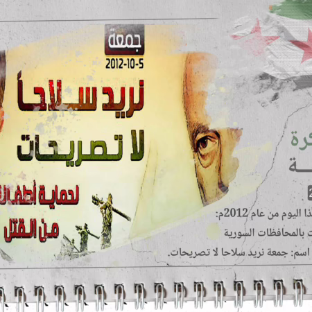 في مثل هذا اليوم من عام 2012م: خرجت مظاهرات بالمحافظات السورية في جمعة حملت اسم: جمعة نريد سلاحا لا تصريحات.